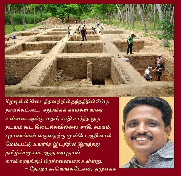 தமிழகத்தில் திட்டமிட்டு பண்பாட்டு குழப்பத்தை காவிக்கும்பல் உருவாக்கிக் கொண்டே இருக்கிறது. இந்திய வரலாற்றைப் புதிதாக எழுதப் போகிறோம் என்று மனிதவள மேம்பாட்டுத்துறை அமைச்சர் கூறியிருக்கிறார். 2 ஆயிரம் ஆண்டுகளுக்கு முந்தைய, ஹரப்பா, மொகஞ்சதாரோ நகர நாகரீகத்தை மிஞ்சிய நாகரீகத்திற்கான தடயங்கள் கீழடியில்100ஏக்கர் பரப்பில் கிடைத்துள்ளன. கிடைத்துள்ள அனைத்து கலைப் பொருட்களும் கலை நுணுக்கத்தோடு நுட்பத்தோடு உள்ளன. இன்றைய பொதுப்பணித்துறை கட்டுகிற கட்டிடத்தில் ஒரு கலை நுணுக்கம் கூட இல்லாமல் சவப்பெட்டிபோல் உள்ளது. இதுதான் நவீனகால கலைமரபு. கீழடியில் கிடைத்தவற்றில் தந்தத்தில் சீப்பு, தாயக்கட்டை, சதுரங்கக் காய்கள் வரை உள்ளன. அங்கு மதம், சாதி சார்ந்த ஒரு தடயம் கூட கிடைக்கவில்லை. சாதி, சமயம், புராணங்கள் வருவதற்கு முன்பே அறிவால் மேம்பட்டு உயர்ந்த இடத்தில் இருந்தது தமிழ்ச்சமூகம். அந்த மரபுதான் காவிகளுக்குப் பிரச்சனையாக உள்ளது.