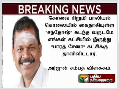 கோவை துடியலூர் சிறுமி பாலியல் வன் கொடுமை மற்றும் கொலை வழக்கின் குற்றவாளி சந்தோஷ் பாரத் சேனா என்ற காவி அமைப்பைச் சேர்ந்தவன் என்பது ஊரறிந்த உண்மை.