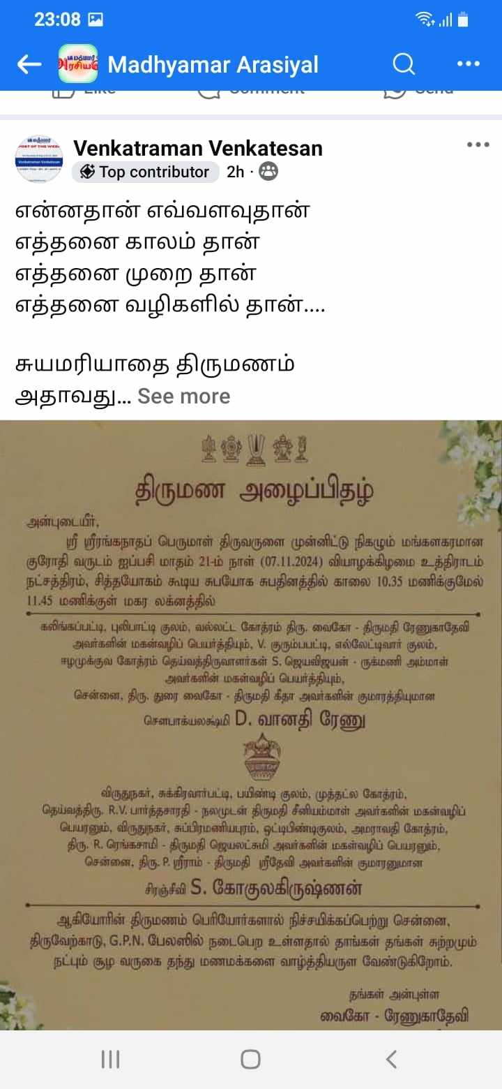 மத்யமர் ஆட்டுக்காரன் குழுவில் நேற்று மட்டும் திரு வைகோ அவர்களின் பேத்தி திருமண அழைப்பிதழை வைத்து ஏழு பதிவுகள். வி.சி.க நடத்திய மது ஒழிப்பு மாநாட்டில் ஆட்டுக்காரன் சொன்னதை தோழர் திருமாவளவன் காப்பியடித்ததாக ஸ்டிக்கர் ஒட்டியதாக ஐந்து பதிவுகள்.